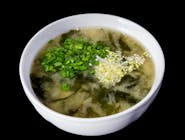 Kawałki łososia , makaron ryżowy, wakame pyszny bulion rybny
